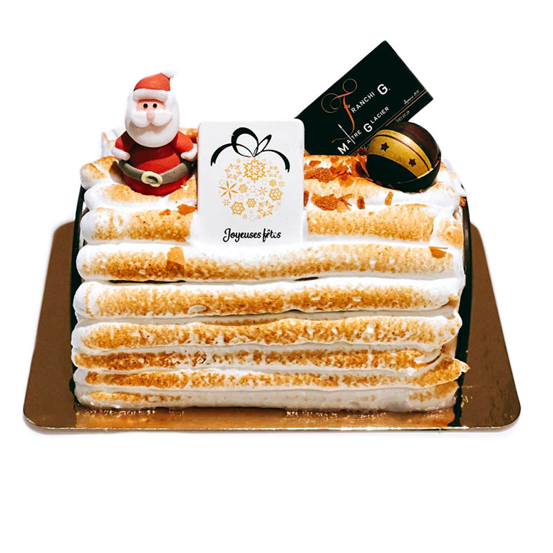 Bûche glace vanille de Madagascar et glace caramel beurre salé, fourrée de nougatine et caramel salé, meringue italienne.