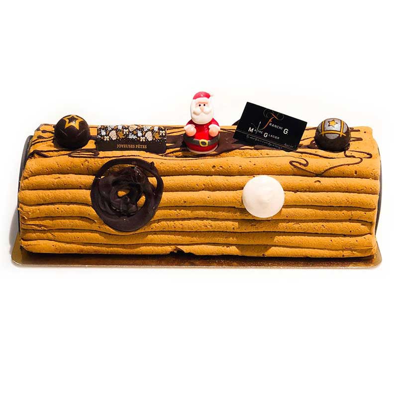 Bûche à la glace vanille de Madagascar, glace praliné, fourré de nougatine et crème fraîche à l’extrait de moka.